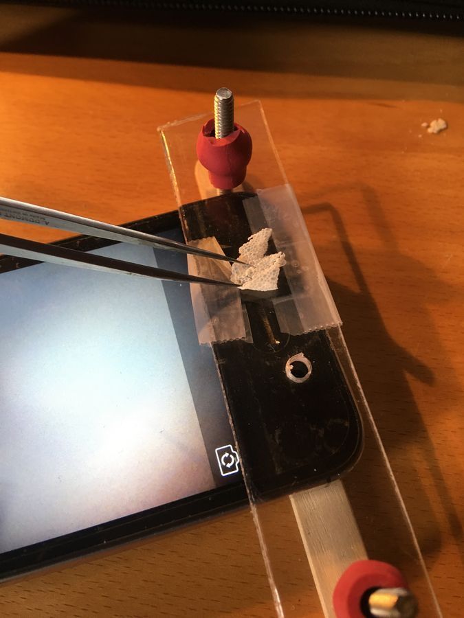 I set up my new popsicle stick FoldScope rig, fired up the flashlight