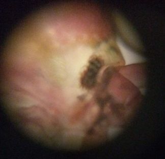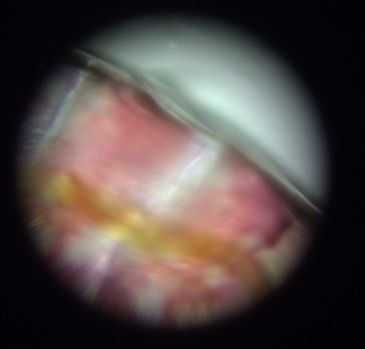 Image of close-up amphipod mouthparts. In my opinion, it is difficult to identify different species of amphipods because they look very similar. For this reason, amphipods are often identified either by their mouthparts, their antennae, or by dissection (Lowry and Springthorpe 2001). By looking at the mouthpart pictures I’ve taken of this specimen, do any amphipod experts out there have an idea of what species this may be? We are fortunate that we have Foldscopes to help us identify organisms such as this! Being able to use Foldscopes in the field to identify smaller specimens is one big perk of this portable tool. I am curious as to what this amphipod may have been eating and using as habitat. In the marine environment, amphipods have been documented as herbivores, scavengers, detritivores, and micropredators (Lowry and Springthorpe 2001). Amphipods have also been documented to eat seaweeds (Duffy and Hay 1991; Duffy 1990). In addition, amphipods help to benefit their environment by grazing on filamentous algae, and reducing the growth of competing algae species (Duffy 1990). Duffy and Hay (1991) point out that since amphipods are so small, to reduce the risk of predation, they may choose to eat plants that also provide them with refuge from predators. We found our amphipod living on a mass of cladophora, a type of green algae we often saw out in the intertidal zone. The cladophora didn’t appear to be the most protective habitat for the amphipod, but maybe it could potentially be a good food source high in nutrient value. I decided to take a sample of the cladophora and put it under my Foldscope to see if I could find anything interesting. Below is the image of the cladophora under my Foldscope.