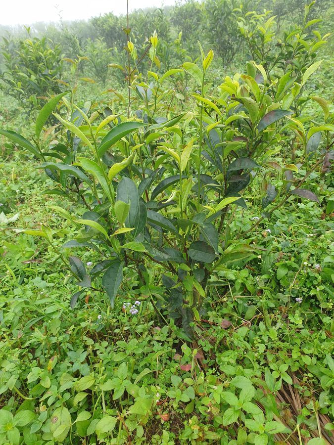 Tea plant with reddish-brown leaves indicating the infestation of red spider mites