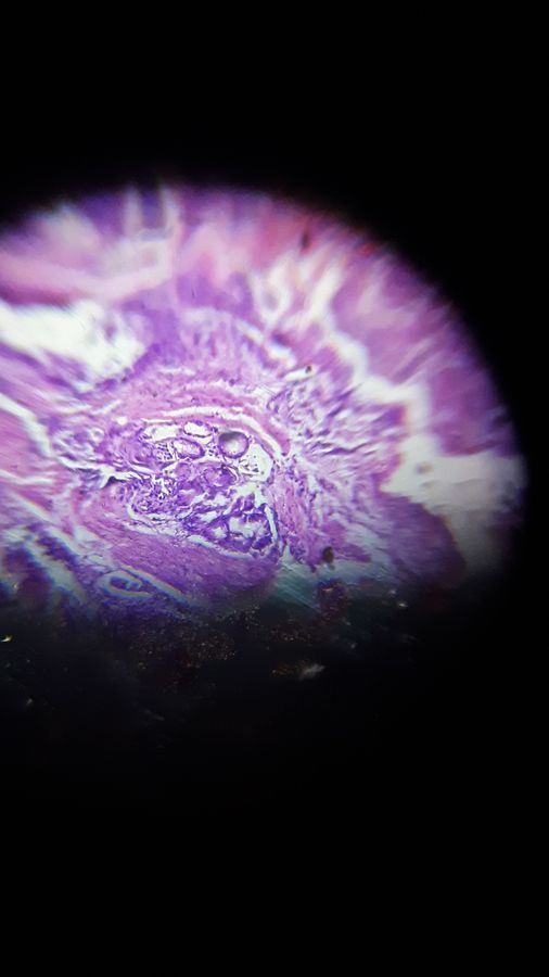 slide section shows bit of bronchial mucosal tissue,hypervascular interstitium shows mucinous glands and a fragment of atypical keratinizing squamous epithelium also showing few scatterted large cells with atypical hyperchromatic nuclei.features suggest anon small cell tumour ,with squamous differentiation.