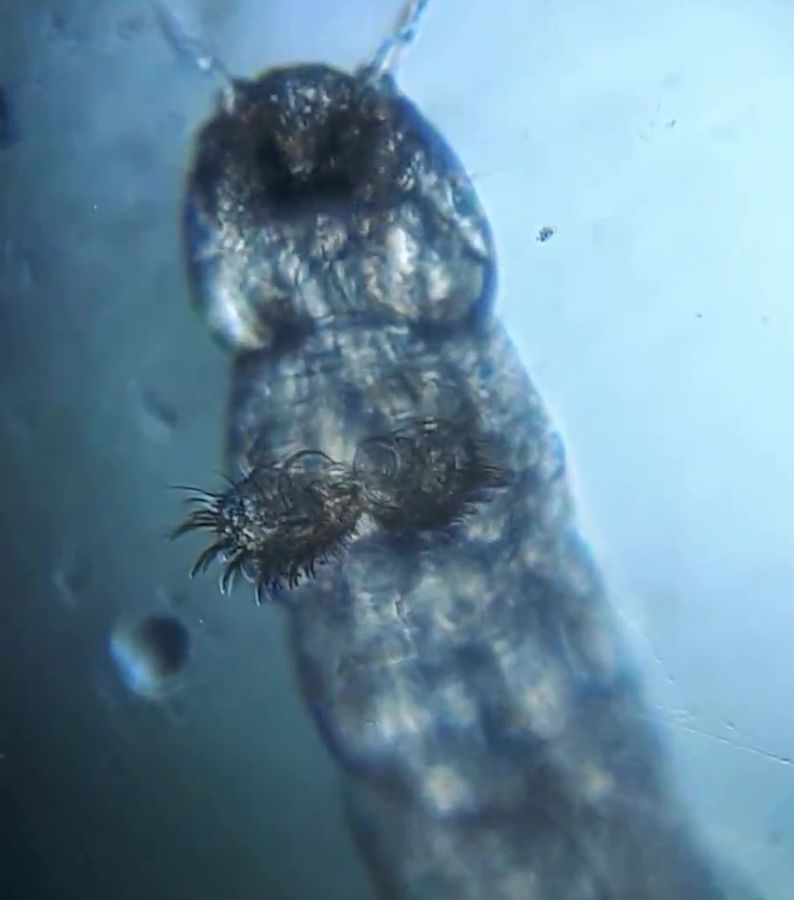 Foldscope is giving daily puzzles and each water sample is with variety of organisms in this rainy season. Observed a small creature in a water sample and it is moving very swift, creating pendulum like movement from anterior to posterior end, body looks like segmented and fore limbs like structures are seen, can see the muscular movement , Guide me to identify this