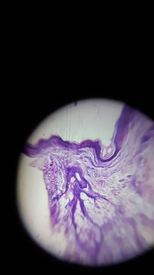 slide section shows skin bits tissues having lined by epidermis having statified squamous epithelium which is devoid rete ridges having keratinization, dermis shows pilosebaceous unit long with fibrovascular collagenization with focal collection of perivascular inflammatory cells.