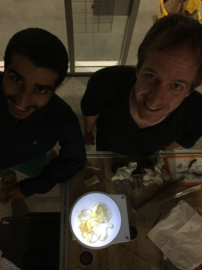 No; that is not a photograph but a live microscopic image ready for you to draw on from another incarnation of Foldscope (follow the blog for more updates later). I could not stop myself from picking a pen and drawing – even if it was 2am in the morning. The image also shows Jim Cybulski and Mark Kirollos – co creators of this magical instrument.
