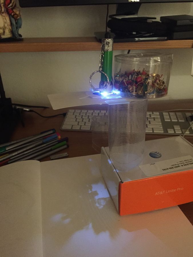 Now with a frugal instrument like foldscope, how do you implement an imaging modality where you can directly trace the drawing. Quiet simply by using “projection mode”. Here is what you will need to complete this post. 1. Read my previous post on Focus locking. It’s crucial for this; since your hands will be free to draw. 2. A simple LED flash light. I used this simple cheap keychain white LED with a “through pin” LED . 3. Pencil and paper (whatever you want to draw/paint with). Start by setting up a focus locked Foldscope with the sample of interest. Use the LED light at the back to produce a nicely aligned projection mode. Now use tape to keep the LED mounted correctly (collimation is very useful and improves the image). Setup the system in such a way that the image formed is actually on a nice flat surface; pointing downwards. This is fairly simple to do – so I just share a image of my configuration. You can build a more permanent cardboard box that holds everything together.