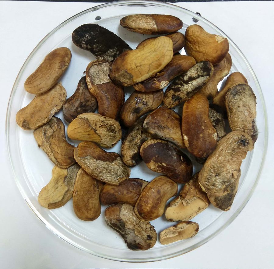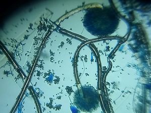 The spores on mango kernels are stained with lactophenol cotton blue solution and observed under foldscope. Lactophenol cotton blue stain is formulated with lactophenol, which serves as a mounting fluid, and cotton blue. Organisms suspended in the stain are killed due to the presence of phenol. Cotton blue is an acid dye that stains the chitin present in the cell walls of fungi.
