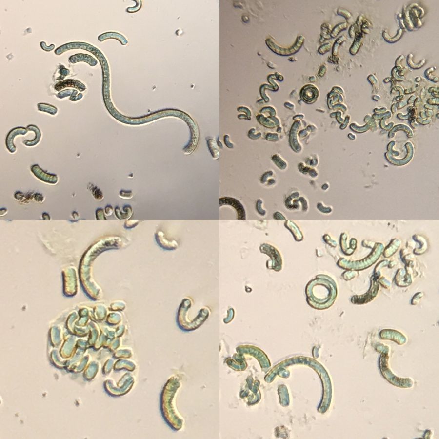The moniker Spirulina is a historical name and the genus of blue-green cyanobacteria you are getting in these supplements is really Arthrospira . Two species are grown for these supplements; A. maxima and A. plaetensis. I’ve tried study the identification keys and with these broken up chains I’m having a real hard time telling which one it is.