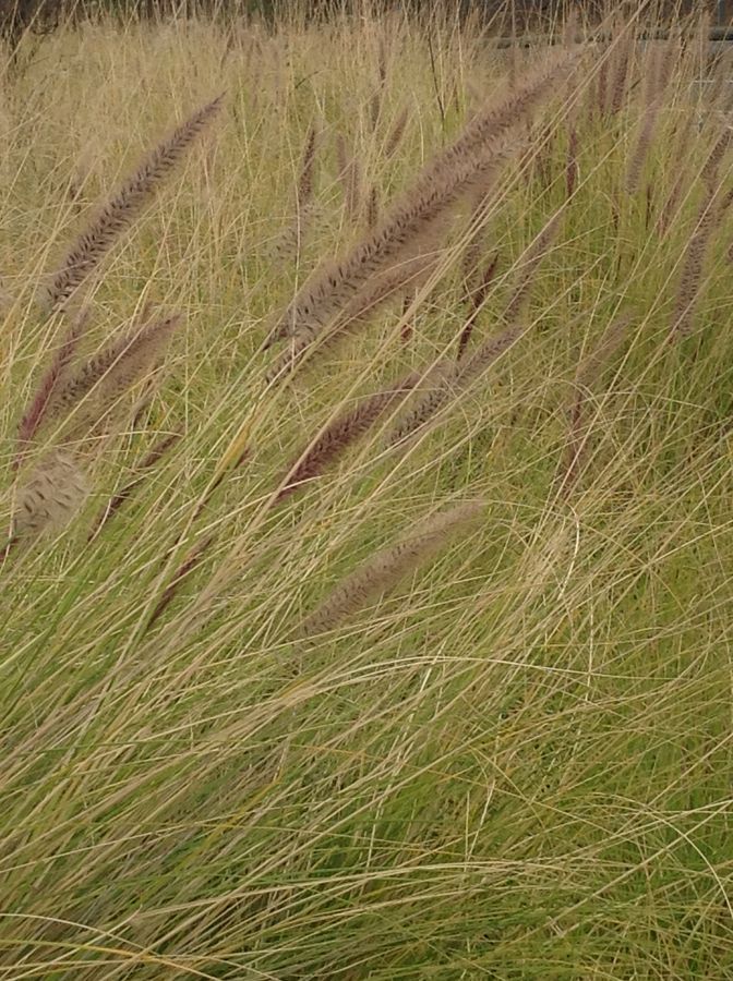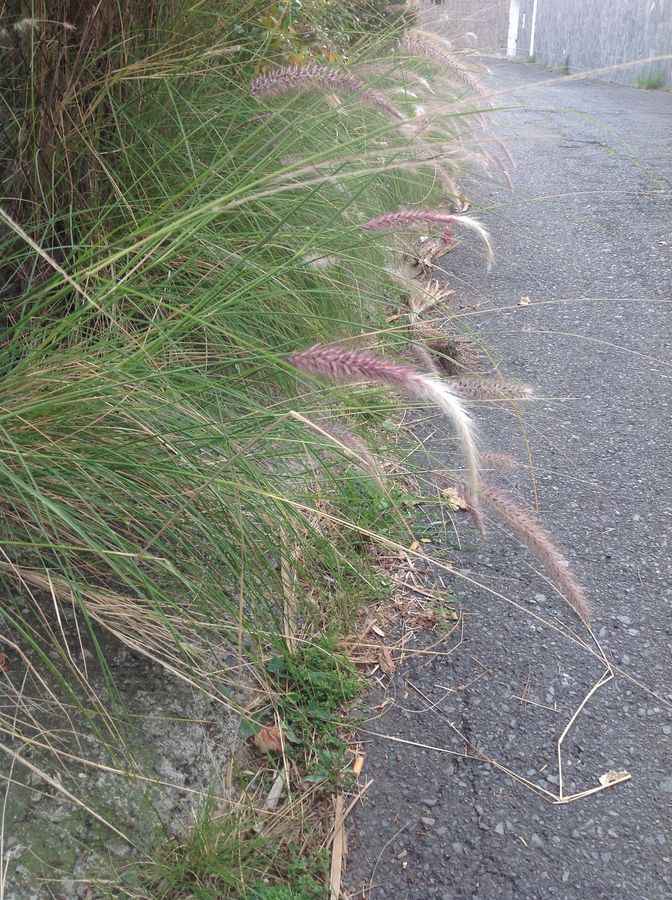 This is Pennisetum setaceum , a grass ( Poaceae ) known as purple fountain grass in many countries abroad. Where I live it is called “rabo de gato”, which is to say “cat’s tail”, something easy to comprehend when seen as follows: