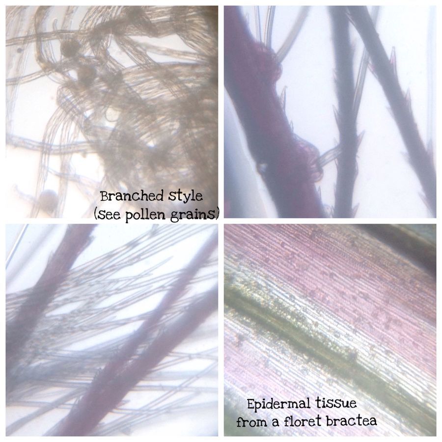 Each floret (flower) carries two densely branched styles, typical characteristic in wind-pollinated species. As seen before, thorns are of all kinds, ensuring dispersal success. Many structures contain a purple pigment, including the scales’ epidermal tissue.
