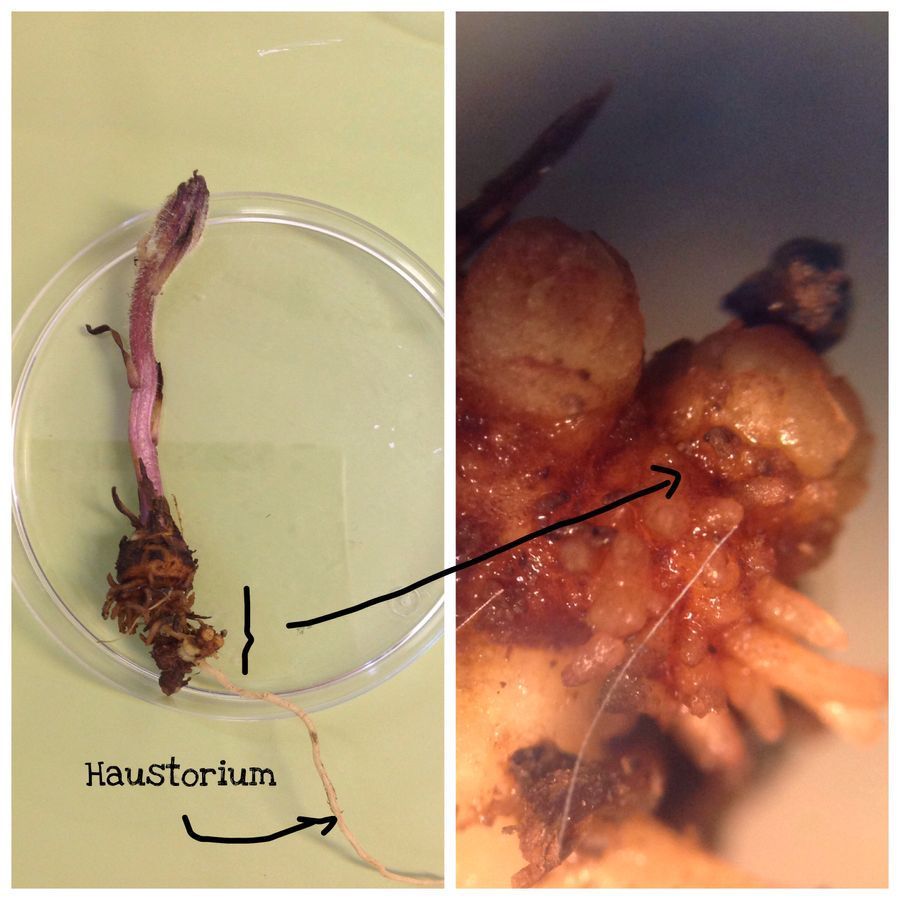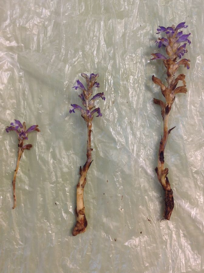 As previously said, species belonging to the genus Orobanche are parasitic herbaceous plants. The haustorium is the part of the plant which attaches the parasite to the host plant and grows into its vascular system. The parasite is then able to draw out water and nutrients, producing a general weakening of the host plant.