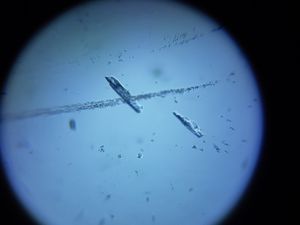 Different unknown structures and scattered black dots were observed under Foldscope. Sample 52.