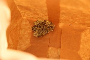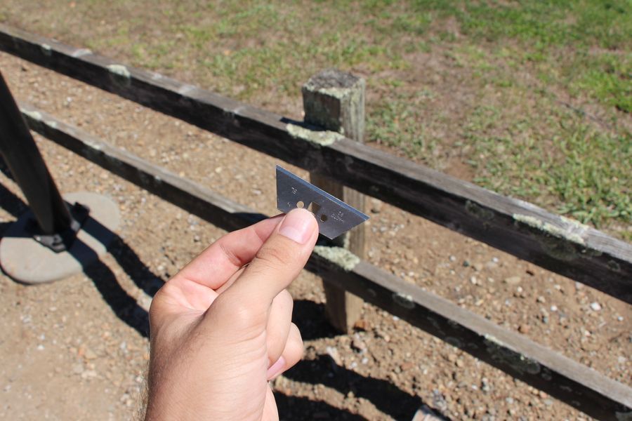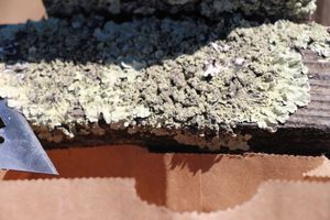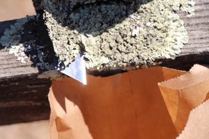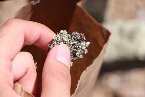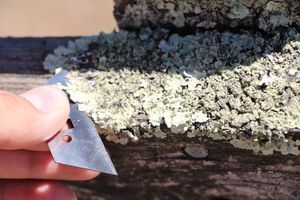 I position the paper bag below the lichen, then begin to scrape the lichen into the bag using the razor blade. Keep the blade nearly flat, and try to lift the lichen off of the surface rather than crushing it up. The bag should catch any small pieces that happen to break off.