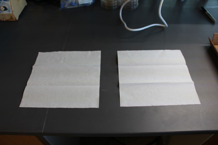 Next I set a pipette on each paper towel for future use in transferring water after rehydration. I use glass Pasteur pipettes with a rubber bulb, but any pipette or eye-dropper should work fine. If you don’t have access to these items, you could also try pouring water after rehydration, using a straw, etc.