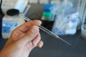 I take my pipette and attach the rubber bulb, then collect some of the water from my soaked samples.