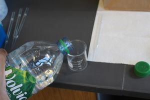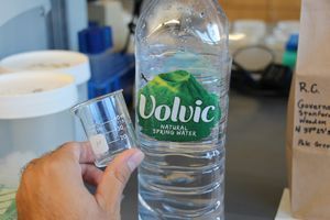 I now take a bottle of spring water and pour out about 20 ml for each sample. It’s fine to do this without measuring the volume of water that you’re using. Just use as much as it takes to comfortably soak your samples.