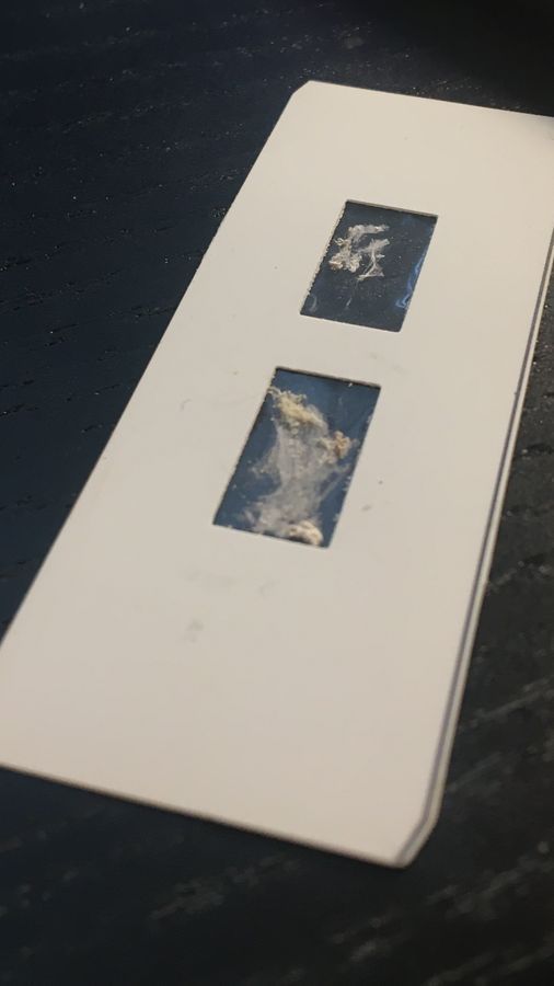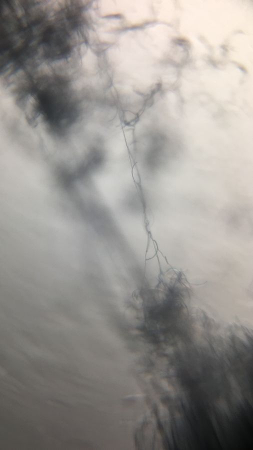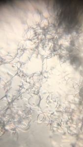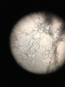 As you can see, in this particular fungi, the thin strands of hyphae are microscopic and would be hard to see with just the naked eye. The Foldscope has allowed me to see size, shape and color of this fungi in more detail! This is a photo of my fungi specimen on the Foldscope slide. Since my specific specimen was quite sticky, I used a toothpick to gather the fungi on the tip and then gently spread it onto my slides. I found that the more specimen present on the slide, the more difficult it was see individual hyphae through the Foldscope. Most of the photos I took was using the half of the slide with the smallest amount of fungal specimen. Therefore, one tip I have when using the Foldscope for fungal discoveries, is to make sure you have a small amount of specimen per slide, and that it is spread thinly over the slide!