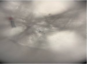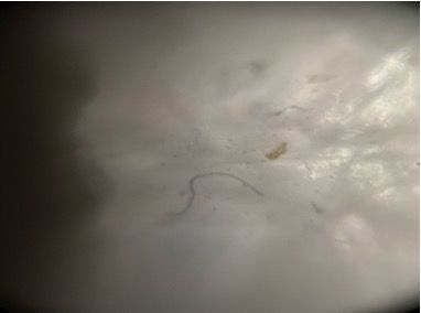 The second image in the series shows what appears to be dust particles again, along with another identified strand-like object. At first glance, it looks like a strand of hair. It cannot, however, be a human hair as this object would be too small to appear at the size it does in the image.