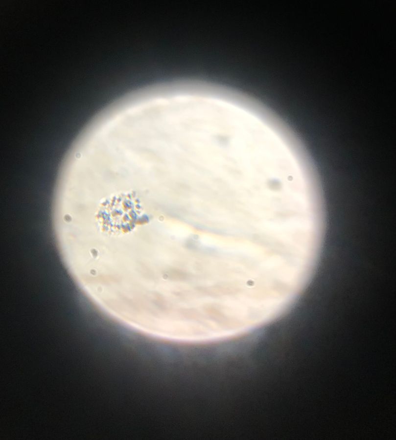 I picked, dried, and dusted a slide with yellow pollen from a flower on campus. I collected the sample from a decorative flowering bush on Stanford campus, California near Wilber dining. I was particularly interested in how the pollen would appear under magnification and if I could see individual pollen granules. I peeled back the petals with a tweezer, and dusted the pollen onto a slide with a clean Q-Tip. Then I used the mini plastic pipette to add a tiny drop of water. Then, I placed another slide on top of the first and secured the slides with scotch tape. I then placed the slide in my foldscope, positioned the foldscope above a light source, and adjusted my focus until the image was clear. This was the resulting image. I surprised by the level of detail I could see. There seemed to be little clumps of granules which formed small circles of their own. This post is for a Bio60_2021 class assignment.