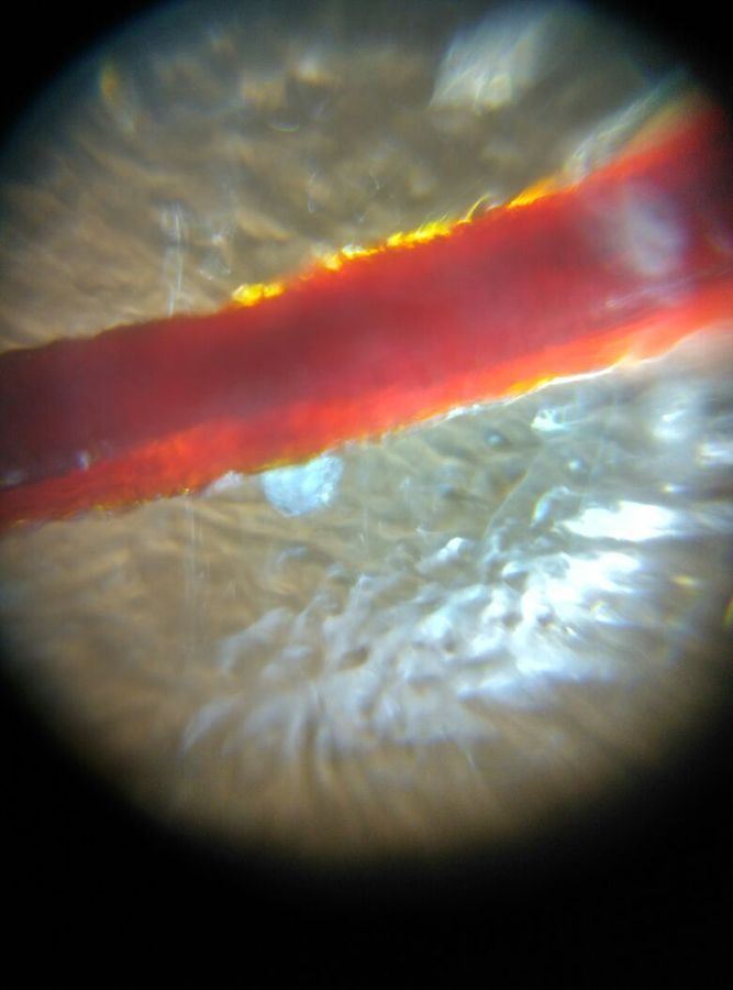 kesar ka dum!!! i made a slide of kesar we all know that kesar is so small but what u see above is a kesar so i placed it in foldscope i observed it like a red streak of blood