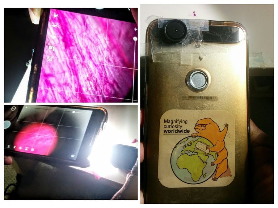 Here is a hack with the new foldscope lens. Using a magnetic coupler and a lens, couple the two onto the phone’s camera-eye. This can be directly used to scan objects. For a reflecting light source, you can use the camera flashlight (if your app allows you to have the flashlight and the camera on simultaneously) or use a flashlight, which is what I used as in the picture below. The hack allows one to explore surfaces like nothing else, and it is tremendously addictive, although you need really steady hands. Here is how the hack looks.