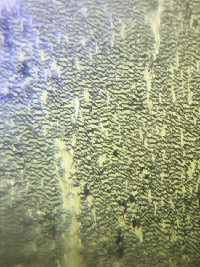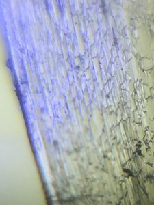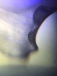 Wow – the edge of freshly cut or torn piece of plastic is actually a fractal structure. The edge is ruffled up in many curvy lines (to me, it looks like a cauliflower leaf edge). Look closely; put it in a foldscope; and you will find that the same pattern is repeated also at the microscale. So it is a true fractal (to a certain magnification); so when you see up close, you see the same pattern repeat as before. Isn’t that funny.