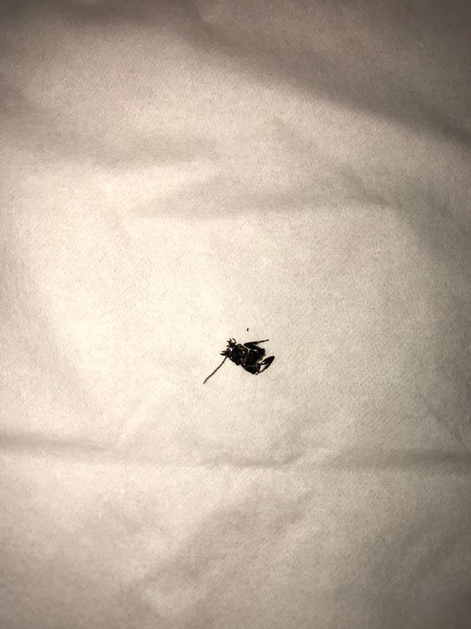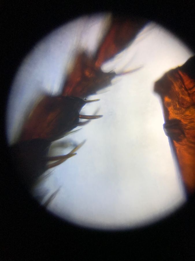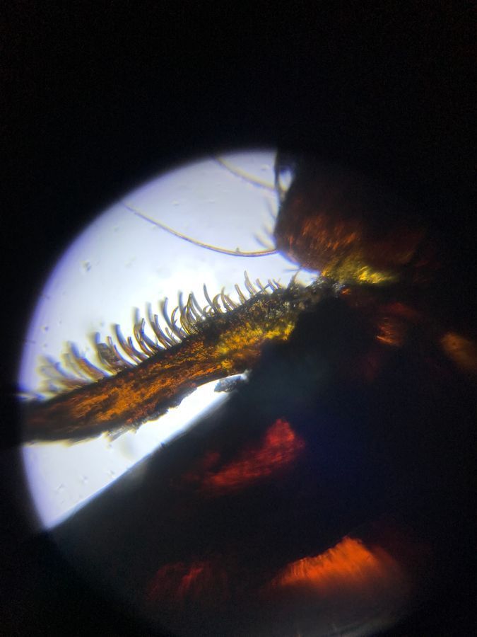 Shown below is a black beetle obtained from a sample of dirt in class. The sample was prepared by capturing the beetle with tweezers, killing it, dissecting it, and crushing it onto a slide. When taking a closer look at this creepy crawler, we only reveal that it is more disgusting under a microscope. The beetle, although appearing black by the naked human eye, appears brown under the microscope as light shines through its exoskeleton. The tiny hairs and fibers of the beetle’s antenna and pincers, which help with its everyday mobility and survival, were also observed and shown below.
