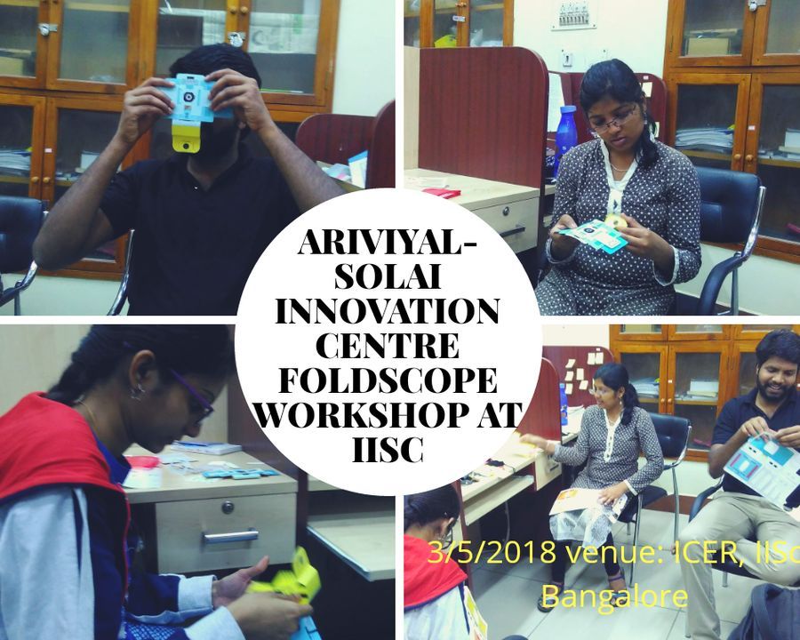 Ariviyal-Solai Innovation Centre founder karthik conduct a workshop for Indian institute of science Bangalore research scholars on 3rd May 2018. Students are actively participate in this workshop. They show interest to be a part of (crew members) AIC and ready to support our low cost paper microscope to spread across the country. We also discussed to improve the foldscope and its application.