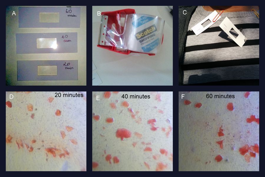 The next challenge was to monitor the pollen in the air. For this I stuck cellophane tape across the foldscope paper slide and pinned it to my shirt. I exposed the paper slides for 20, 40 and 60 minutes during my morning walk. Although many things were stuck, they did not resemble pollen grains (Figure 2D-F). There were some interesting shapes though I cant believe that we are constantly being bombarded by something other than molecules of air :). BTW, for some time I was convincing myself that these are pollen until the expert brought me down to reality (Talk about delusions).