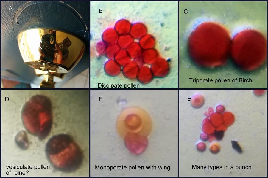 Ever since the foldscope arrived, I have been thinking about this series of experiments for monitoring air-borne allergens using the foldscope. However, to be of any serious use one needs to understand its feasibility and limitations. First what do they look like? On the first warm day of Spring, I looked at my door lock (Figure 1A) and found a dust layer of what I thought was pollen. I took a cellophane tape and stuck it to the lock and ripped off whatever stuck to it. I then put the sticky end face down on a slide with a very dilute solution of Safranin O (1 drop of Safranin O in 19 drops of water). The pollen stained satisfactorily (Figure 1B-F). I could detect at least 4 different types (and perhaps a fifth one). My best guesses for at least two of the pollen sources are in Figure 1. However, I need to find a good key for the rest and need to develop an eye for them. These shapes are truly amazing and I can see how palynologists can spend a life time studying them. The major pollen types listed by pollen.com around the days of my sampling were maple, birch, elm, poplar and willow, of which I only saw the birch type. I didnt see the other types of pollen on my door knob, which means that either my local area profile is different or that these might have accumulated on my lock over some time.