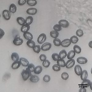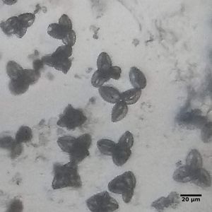MORE POLLEN?? Definitely not tetrads though! By my estimate these are also 20 microns in length and 10 microns in diameter — probably also pollen. These pollen seem to be about the same size as the individual pollen in the tetrad pollen (for comparison, notice in the top right side of the first image: a tetrad pollen that has snuck in). The tetrad pollen is somewhat darker too. I took an image of a single squashed small undetermined thing just to confirm that I wasn’t somehow breaking up the tetrads: