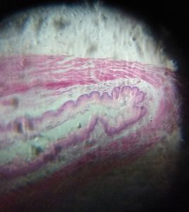 Section of Ileum After assembling foldscopes, though initially students were a little skeptical about the working of foldscope, but they were overwhelmed when they observed their slides and clicked the pictures on their mobile phones. I am posting few of the pictures taken by them in workshop at GGDSD College, Chandigarh