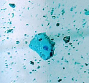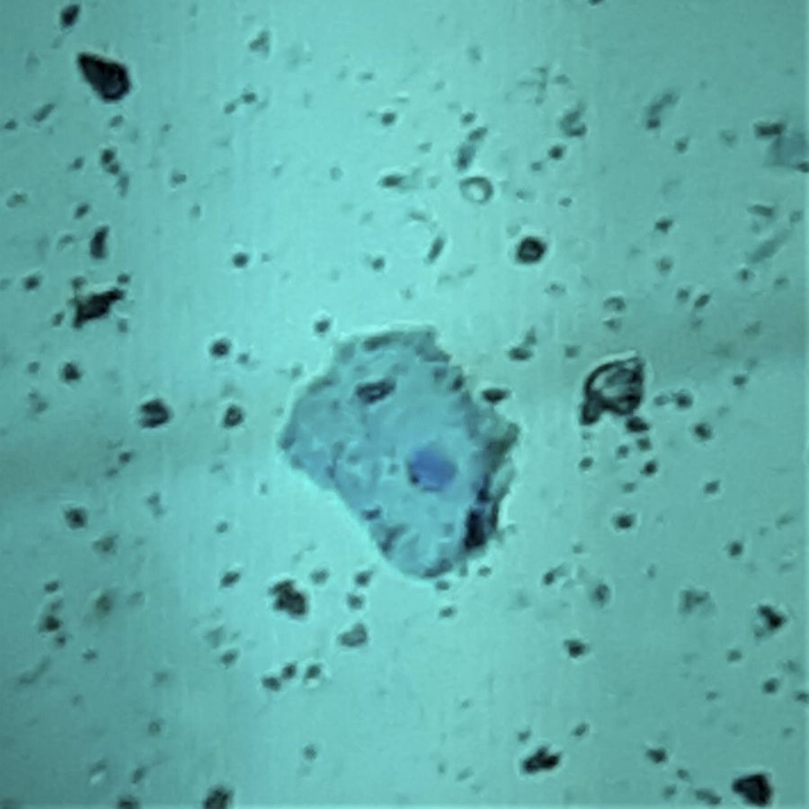 A Barr body (named after discoverer Murray Barr) is the inactive X chromosome in a female somatic cell, also called as sex chromatin. Human females have two X chromosomes, while males have one X and one Y. In all of the female somatic cells, one of the X chromosomes is active, and the other is inactivated in a process called lyonization, becoming the Barr body. The reason for shutting off one X chromosome is so that only the necessary amount of genetic information is expressed, rather than double or even more. Barr body can be observed in female cheek cells by staining with Methylene blue. The nucleus absorbs the stain and appears blue and this Barr body appears in thick blue colour on the edge of the nucleus. In the images taken by foldscope Barr body is very clear on the rim of the nucleus and oral bacteria surrounding the cheek cells.