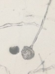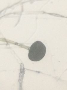 Milk cream left out in open inadvertently during rainy season showed a moldy growth. When seen under a foldscope, a network of aseptate hyphae could be figured. Some sporangiophores bearing sporangia were seen. Trying to go for its identification it was a black mold with white cottony hyphae. The sporangiophores were spherical in shape and in some columella was visible. Either filled or empty sporangia were seen. Another unique thing seen was spores released in a sac-like thing as whole. No stolons were visible. Branching in hyphae was also seen. So now whether it is Rhizopus or Mucor or Absidia —–I am not clear.