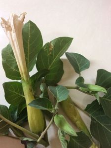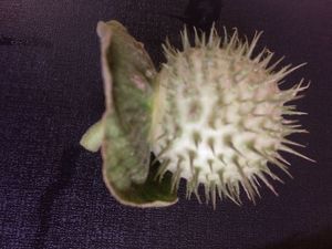 Thorn apple – one of the poisonous flowering plant in nightshade family was seen growing along the banks of Ghaggar river in Panchkula district of Haryana (India). It commonly grows as a weed in waste lands along roadside and railway lines. It has trumpet shaped flowers and a spiny capsular fruit with numerous seeds. The plant contains potent alkaloids of pharmaceutical importance.