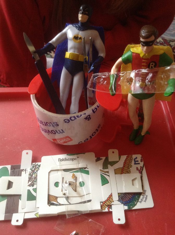 As Batman and Robin found out this morning, using just tape to make a slide is far faster & easier than trying to mount it onto the plastic ones provided or paper ones. It has fewer air pockets which makes better viewing. I prefer the staples packaging tape to all others as it tends to be the clearest and cheapest. As a Homeschooler it is my fast, cheap mini laminator. I haven’t tried this with a wet sample yet but suspect water tension is critical if it is to work at all. 1. Take a section of tape between 5-7 centimeters long. 2. Bend the corners back in order to secure it to a surface. Or have an assistant hold down the corners. 3. Mount your whatever, in this case a dead bug dissected this morning. Be careful to only use half the tape lengthwise. 3. Fold the tape in half or better yet almost in half lengthwise leaving a small border which can be folded over again securing the slide. It should just fit into the foldscope. We like this better as there were fewer air pockets, more mounting/viewing area, and was faster as well as more forgiving to assemble. I am curious if anyone else finds this helpful.