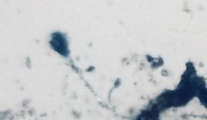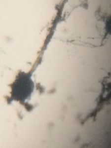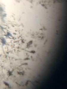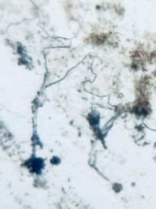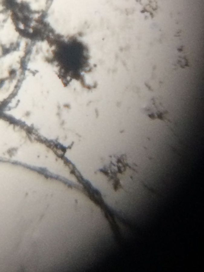 I bought a green coconut for relishing its water, but landed up throwing in dustbin as blue mold had grown on its top.The coconut had rotten either in storage or due to prevailing rainy weather. Took a cello tape and fixed the mold on a slide to observe it under a foldscope. I could see a dense mat of hyphae and chains of conidia hanging out on conidiophores.
