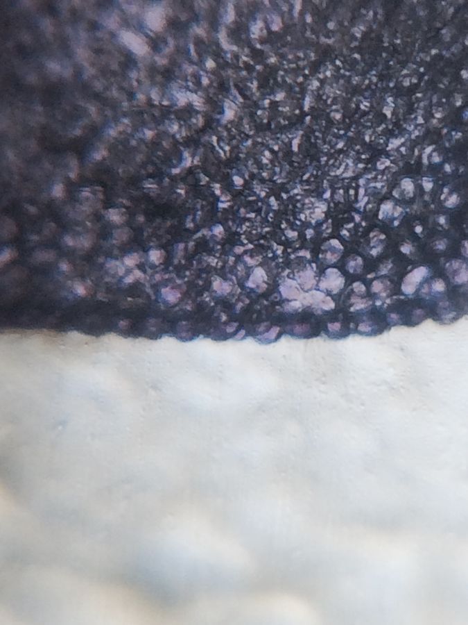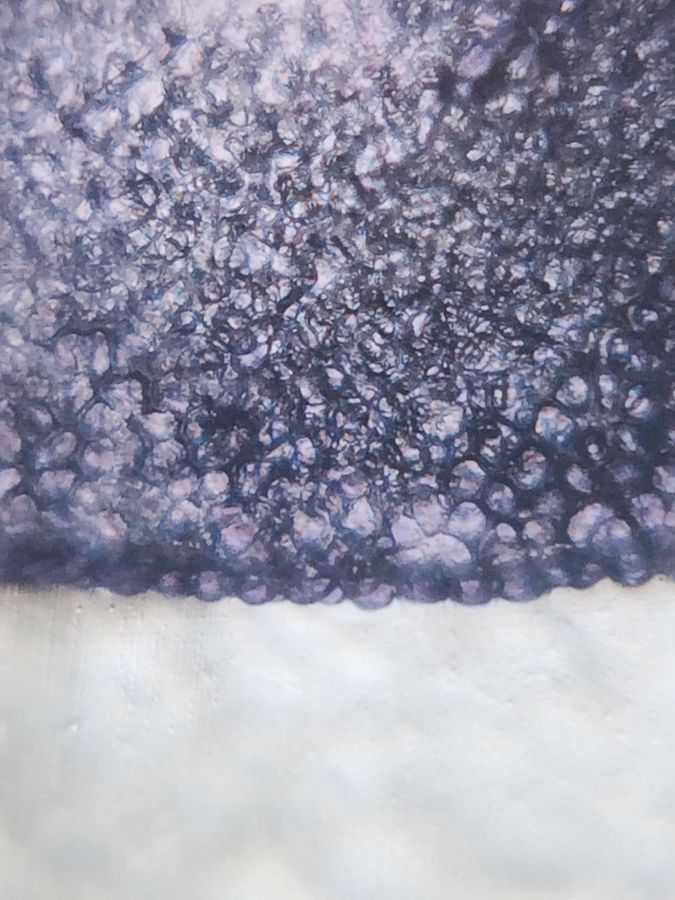 Here, we can see a purple flower petal viewed using the Foldoscope, and the result is simple yet elegant. Not only are they not rectangular, the cells are all circular and clumped together. It is hypothesized that this shape for flower petal plant cells are optimized for pigment absorption in that they focus light more easily for absorption. Another hypothesis for this trait may also be tied to pure aesthetics: the circular shape allows for a more fine-tuned texture that is more desirable for pollinators.