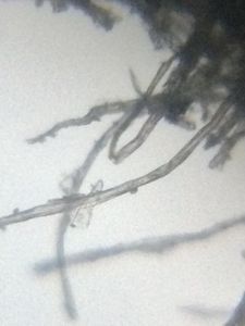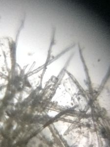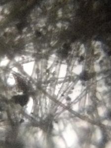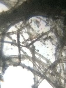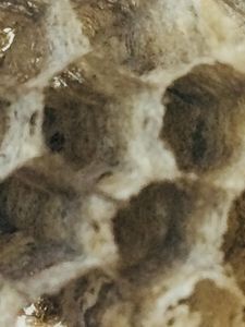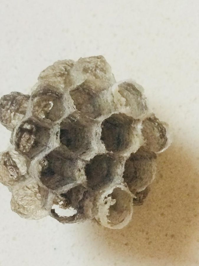 A fallen paper nest of wasp was seen outside my bedroom window. It was empty and probably the wasps had flown away. I picked it up to observe its structure through a foldscope. I was able to see a criss-cross of fibers inter-woven to form hexagonal compartments of a wasp nest.