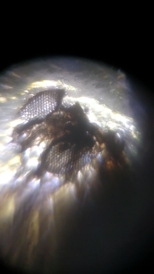 I found a bug drowning in the water carafe at dinner in Nantes, France. I tried to save it but it died anyway, so of course I whipped out my foldscope. I expected to see some nice wings and legs but was amazed to stumble across the eyes staring back at me. Note you can see all the lenses.