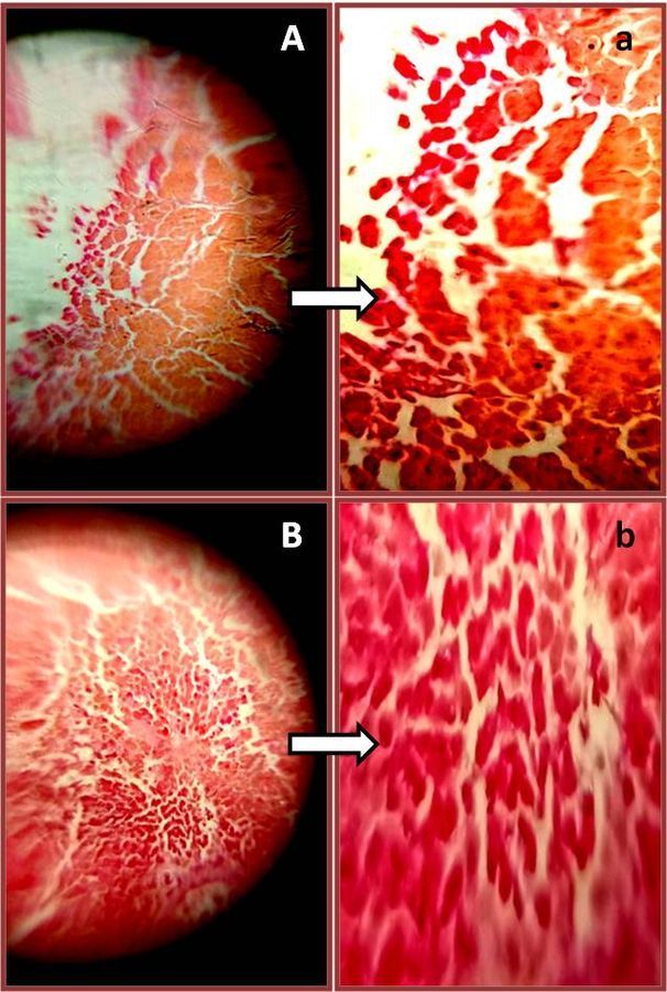 Oil red-O Stained Rat liver section – DEN induced hepatocarcinogenesis observed under foldscope. Panel A & B shows positive Oil red–O stained DEN treated rat liver sections in different groups. Upper Panel shows the liver section of rat from initiation group and the lower section shows from promotion group. In initiation group (Panel A) some of the cells are getting positive staining but the staining is more in promotion group (Panel B) as as lipogenic molecules are more active in this stage. a & b images are zoom out (3X) images of panel A & B respectively.
