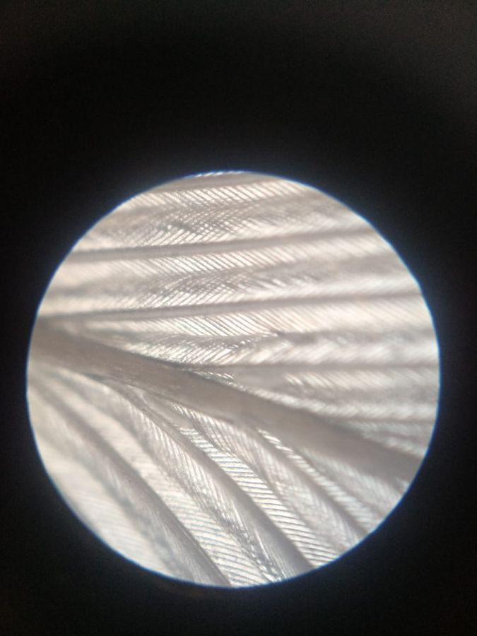 The feather seen here is remige contour feather of budgerigar. The feather looks white and blue under naked eye. the hair extensions are well visible and the colour is given due to pigment present and due to prism like structures which give the blue colouration.