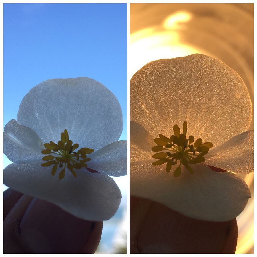 I just picked my morning coffee; and walking back the I noticed a tiny white flower shining like a beacon of light. I could not believe my eyes; it looked as if the flower was producing its own light. What was really happening was light was shining on the petals in a strange way. A small observation like his enough for me to actually take a closer look; and I did pluck the flower (although it seemed like the Resturant owner might not have been happy). One day, I will explain to him that it was all for science. I took the picture of the flower (please help me identify this – it looks like a common gardening flower) in transmitted light. Notice the strange shimmer.