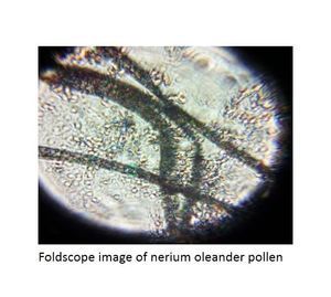 A clean slide was taken, wiped with ethanol and few drops of water was put on it. Here Jasmine pollen and nerium oleander was taken and was gently taped over the drop of water. We then observed it under microscope 10x and compared it with that under foldscope.