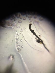 These photos were taken with a foldscope on a small dirt sample taken outside on Princeton University’s campus. This location was in the middle of a small clearing, about 10m away from a road. The bubbles are due to incomplete compression of the two stickers coming together, but as you can see, aside from dirt clumps, there is also a clear root with some dirt coming off of it. This was a damp, rich dirt, thus creating a homogenous fine powder over the slide was difficult and resulted in the clumps of material seen below.