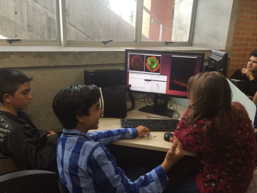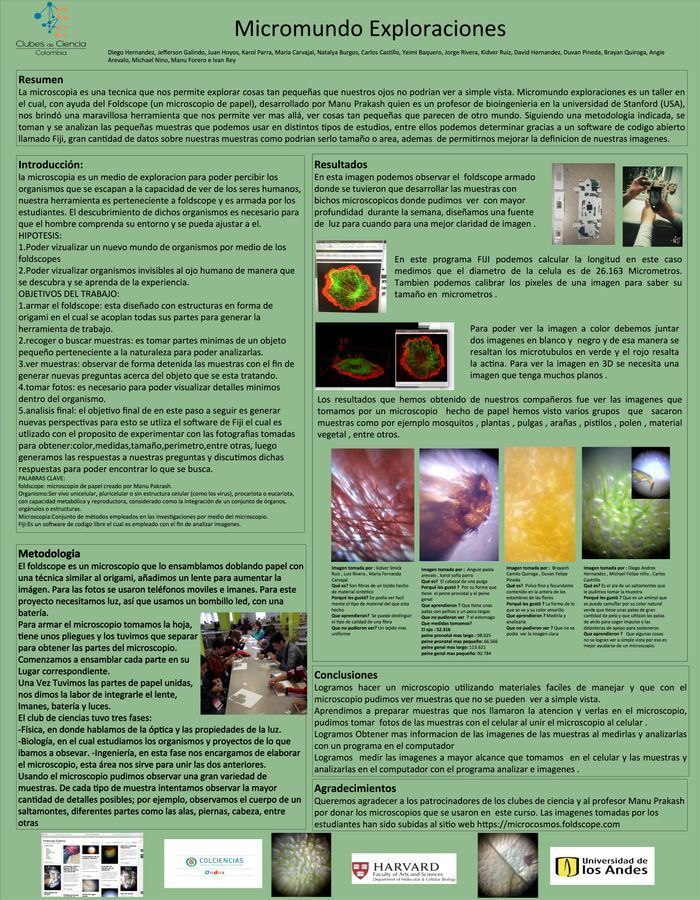 Learning by watching: Explorations at the cellular scale and beyond (Aprendiendo al observar: Exploraciones en la escala celular y mas alla) Last week the inaugural version of Clubes de Ciencia Colombia event took place in Bogota and Medellin. The idea behind this program is to bring graduate students in the US back to Colombia to teach an intensive 1-week course (on a topic of their expertise) to kids finishing high school or starting college (see link: http://www.clubesdeciencia.co ) I designed a microscopy course on which students could get a grasp on the theoretical and practical concepts behind microscopy. Professor Manu Forero at Universidad de los Andes and me were the instructors of the 15 kids (ages 14-17) that participated in the microword explorations course! Professor Manu Prakash very generously donated several Foldscope kits for this purpose. The main idea of the course was to teach the kids to assemble the foldscope, learn to use it, and then to learn to extract information of the images obtained. A secondary purpose was to teach them the multiscalar role of shape and structure in the biological function. Another objective of the course was to show the interdisciplinary nature of microscopy, from the physics required to understand the nature of light and optics laws, passing by the engineering involved in the actual assembly and operation of a microscope to the observations made thanks to microscopy that allow a better understanding of living beings and enrich biology. This course was sponsored by the Ondas program of Colciencias and Sena (governmental institutions) and it was held at Universidad de Los Andes in Bogota, Colombia. Below the schedule of the course per day as was actually given: Day 1: Instructors introduced themselves and explained how they got there (academic career) Lecture on the properties of light, light-matter interaction, Snell’s law (with practical demonstration) and lenses. The students visited the Biophysics lab at Uniandes and watched the optical setup of a light sheet microscope (SPIM), learned about fluorescence with samples and lasers, and observed by themselves Jurkat cells immunofluorescently labeled on an epi-fluorescence wide field microscope. Day 2: Students listened to Manu’s letter introducing them to the global network of microcosmos explorers (in Spanish of course)