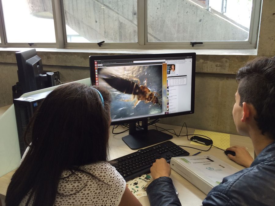 Day 4: The students worked in small groups in the preparation of samples, capturing images with cell phones attached to the Foldscope, camera calibration and basic image analysis. The image below shows students measuring a bug using Fiji.