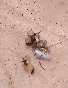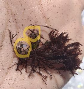 I found these mollusk eggs between the leaves of the red algae yuyos. The mollusk could be the bivalve known as "Choro" of the Mytilidae family. These are very common to find on the coasts. They are also used in gastronomic dishes.